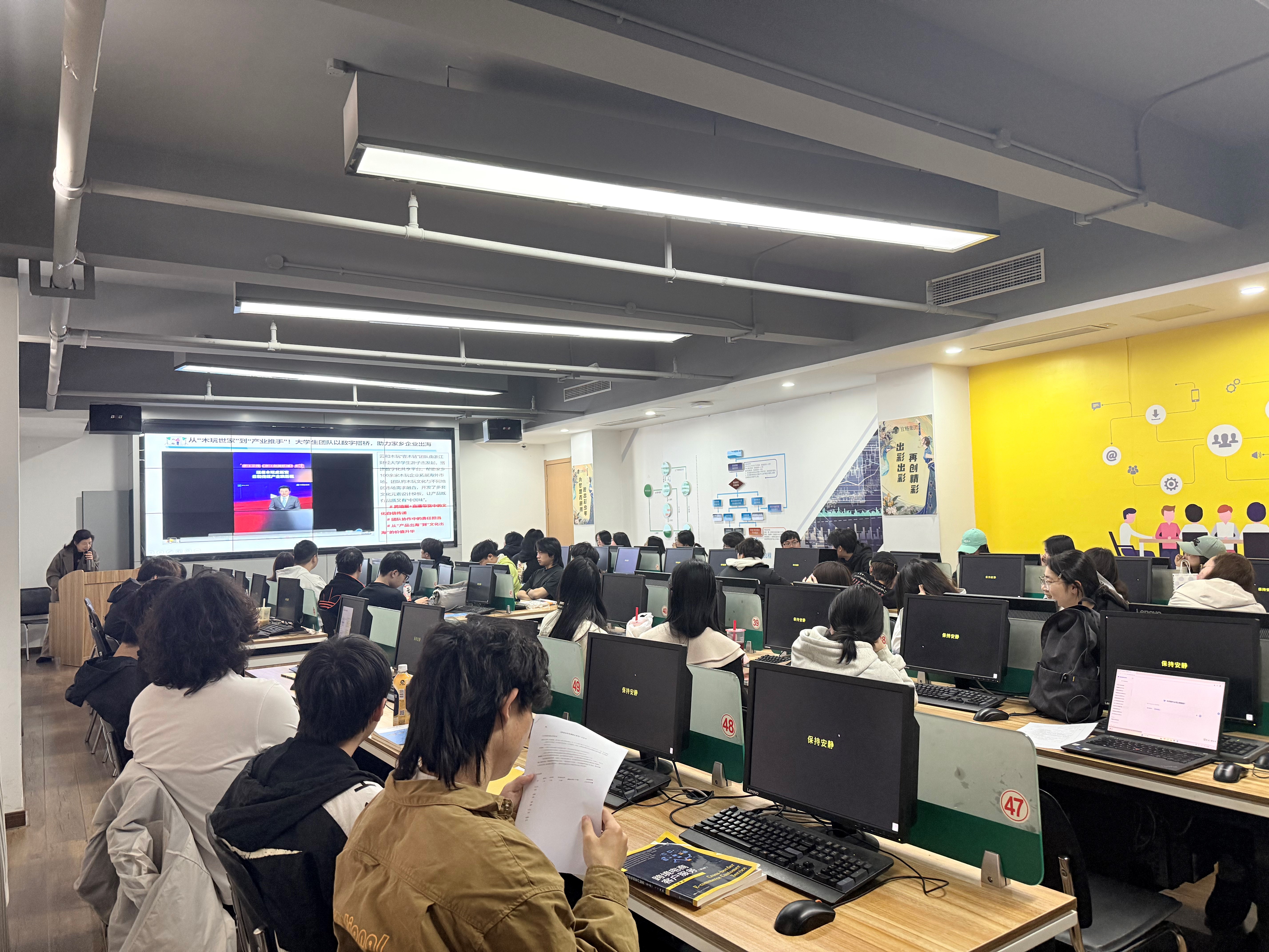 课程开始,姜老师以“木玩世家”到“产业推手”的案例为引,介绍了浙江财经大学“壹木链”团队如何通过数字化平台助力云和木玩企业拓展海外市场。教师适时设问:“如果让你为一件中国产品做一场TIKTOK直播,你会如何讲好它的故事?”这一问题迅速点燃学生思考热情,课堂气氛活跃起来。