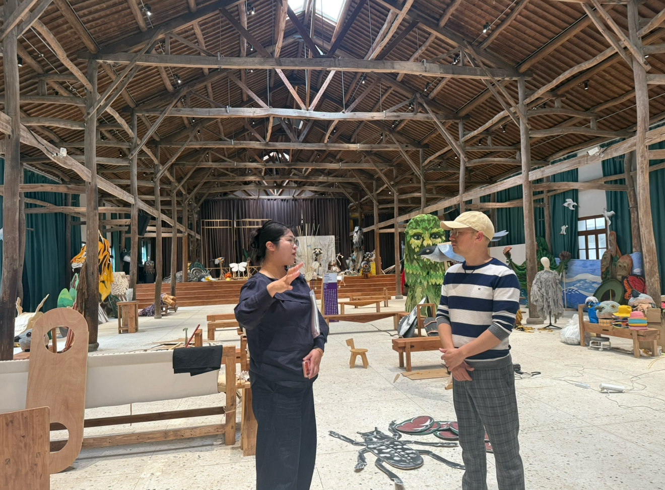 在主理人董委的陪同与讲解下,调研组全面了解了该工作室作为“亲子领域创意内容综合服务商”的定位与多元业务,在原创主题偶剧、儿童情景剧的创作,以及艺术巡游、主题快闪展览与空间装饰方面有丰富的实践经验。尤为值得关注的是,该工作室近年来专注于“从全案策划、创意活动、平面设计到主题策展、空间改造”的一站式服务,其业务模块与学院各专业的核心课程与培养内容较为匹配。且该工作室打造的未来乡村访客中心3.0模式致力于将基于青山村的原创内容推广至上海、深圳、武汉、北京等多个城市,这种“基于地方,又不局限于地方”的运营理念以及与当地村民共创的模式,为学院学生提供了参与社会设计、乡村文旅创新的宝贵实践场景。