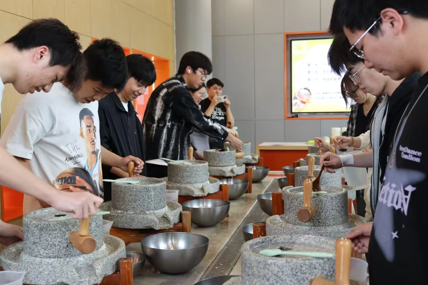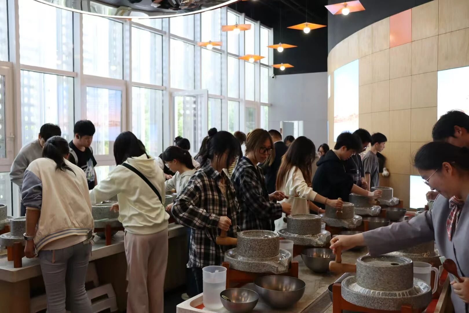 在体验区,同学们参与了非遗石磨豆浆体验活动。在九阳老师指导下,大家亲手推动石磨,研磨黄豆,观察豆浆缓缓流出的过程。慢工细活中,大家体会到传统饮食文化的智慧与匠心。
