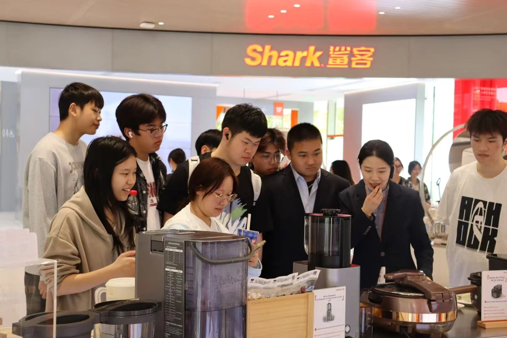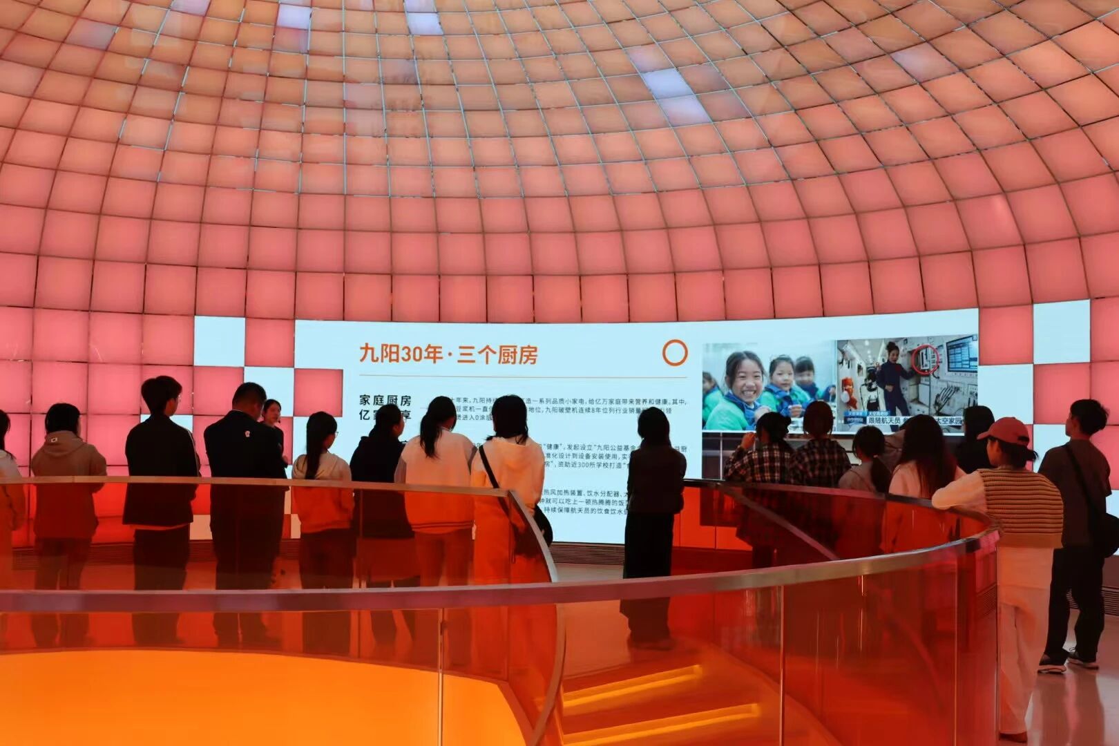 在九阳品牌体验馆,大家依次参观了“时代明星产品”展区和“三个厨房”主题空间。从第一台全自动豆浆机到最新款的智能破壁机,一件件“明星产品”串联起九阳从创立至今的创新足迹。“家庭厨房”“公益厨房”与“太空厨房”三大场景,让同学们直观感受到科技如何融入日常,甚至助力中国空间站航天员的饮食保障。