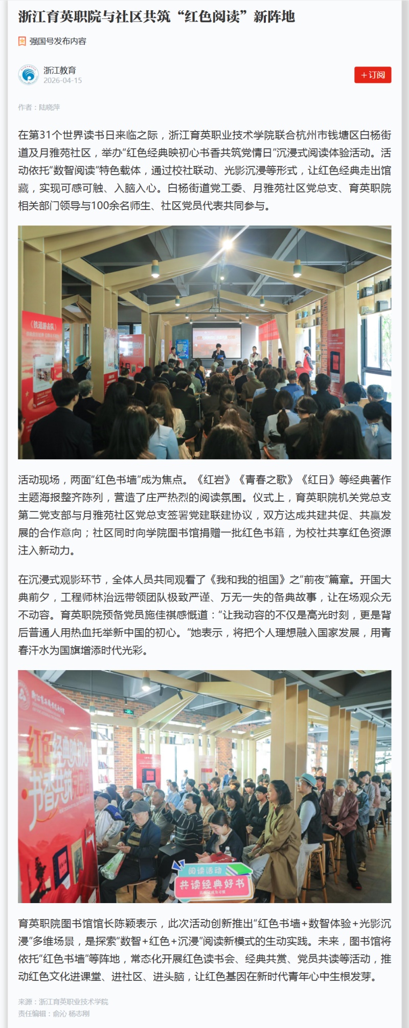 在第31个世界读书日来临之际,浙江育英职业技术学院联合杭州市钱塘区白杨街道及月雅苑社区,举办“红色经典映初心书香共筑党情日”沉浸式阅读体验活动。活动依托“数智阅读”特色载体,通过校社联动、光影沉浸等形式,让红色经典走出馆藏,实现可感可触、入脑入心。白杨街道党工委、月雅苑社区党总支、育英职院相关部门领导与100余名师生、社区党员代表共同参与。