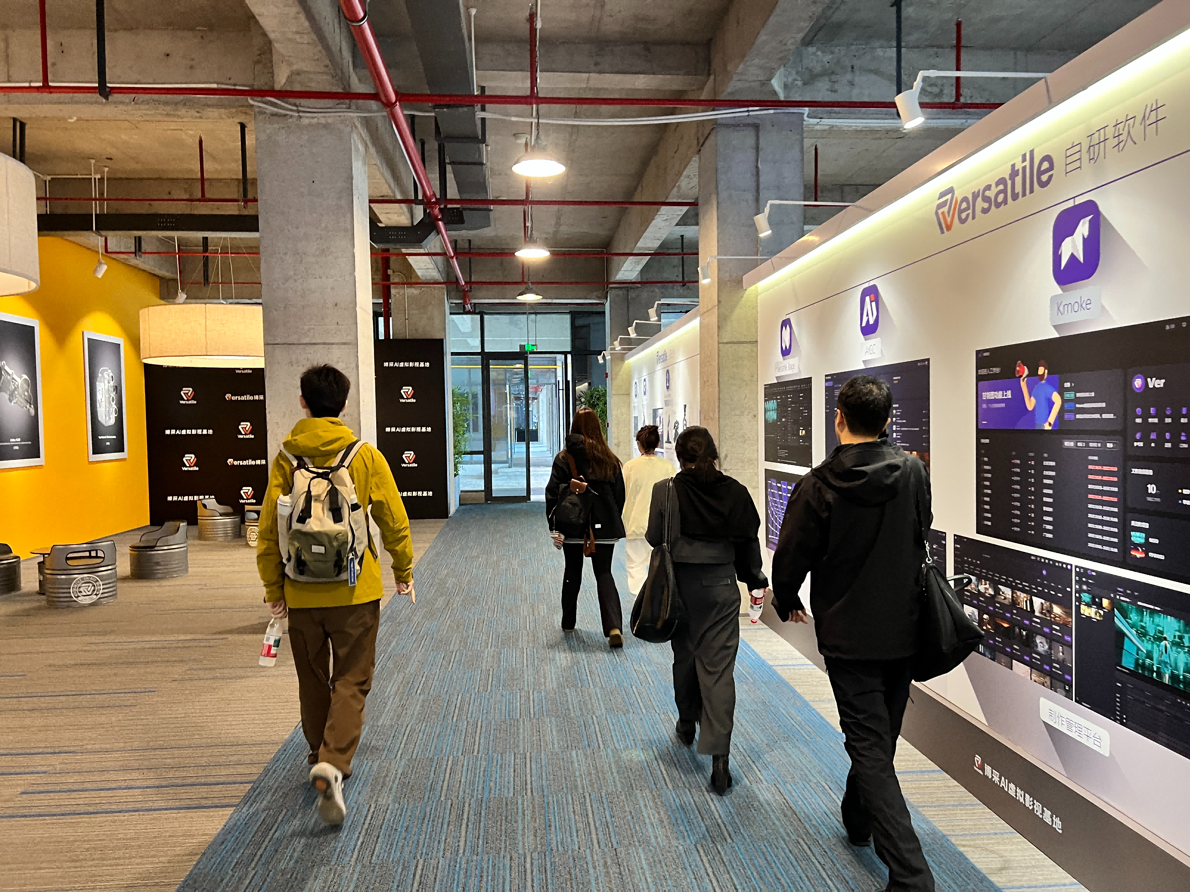 在企业负责人的引导下,数媒教师团队首先走进核心 LED 虚拟摄影棚,随后,团队来到 AI 影视后期工位区,深入了解了企业最新的工作标准和技术规范。此外,调研团队还实地考察了员工食堂、宿舍及休闲活动区,细致询问了实训学生的食宿安排、日常管理及安全保障措施,确保未来学生实训期间的生活质量与安全。