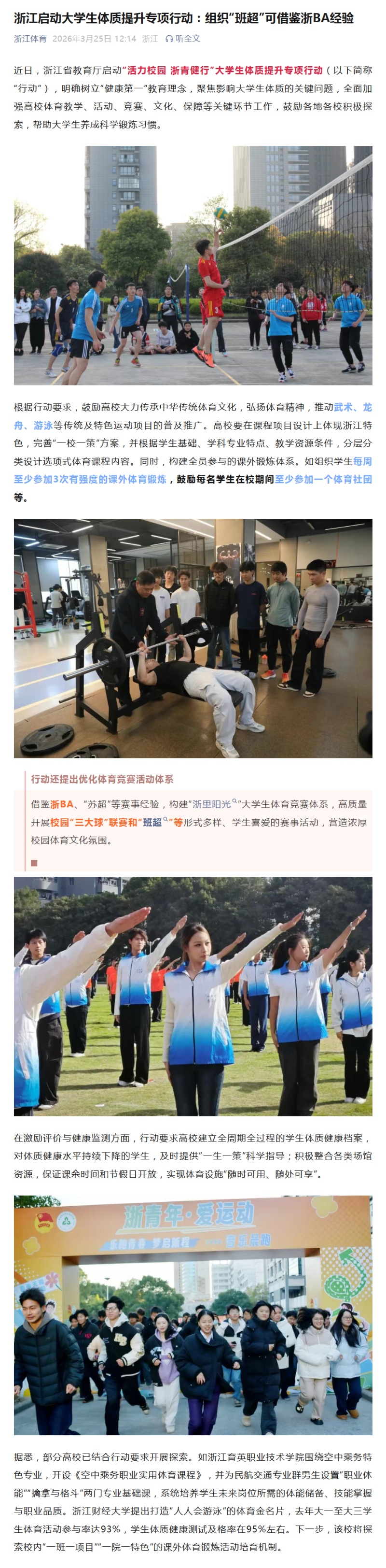 行动还提出优化体育竞赛活动体系借鉴浙BA、“苏超”等赛事经验,构建“浙里阳光”大学生体育竞赛体系,高质量开展校园“三大球”联赛和“班超”等形式多样、学生喜爱的赛事活动,营造浓厚校园体育文化氛围。