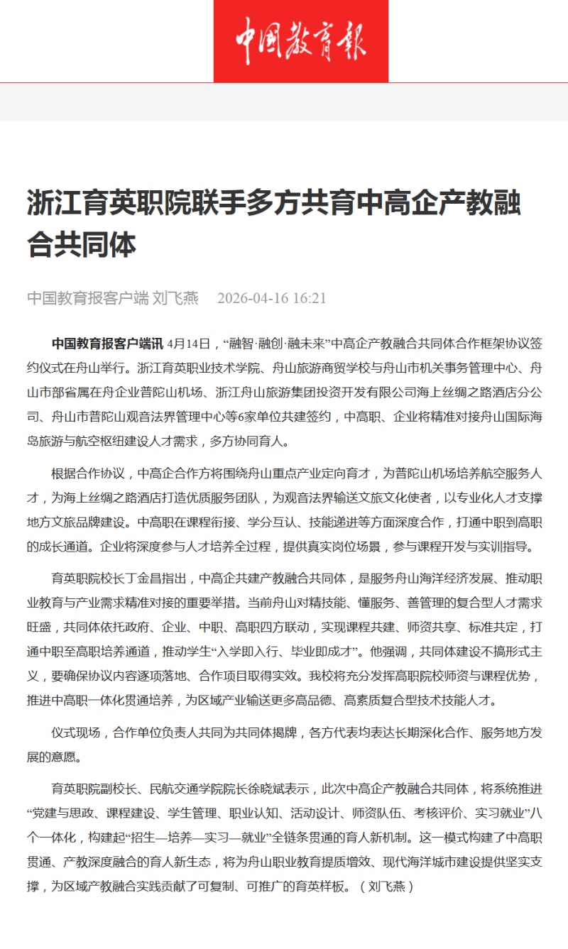 育英职院副校长、民航交通学院院长徐晓斌表示,此次中高企产教融合共同体,将系统推进“党建与思政、课程建设、学生管理、职业认知、活动设计、师资队伍、考核评价、实习就业”八个一体化,构建起“招生—培养—实习—就业”全链条贯通的育人新机制。这一模式构建了中高职贯通、产教深度融合的育人新生态,将为舟山职业教育提质增效、现代海洋城市建设提供坚实支撑,为区域产教融合实践贡献了可复制、可推广的育英样板。(刘飞燕)