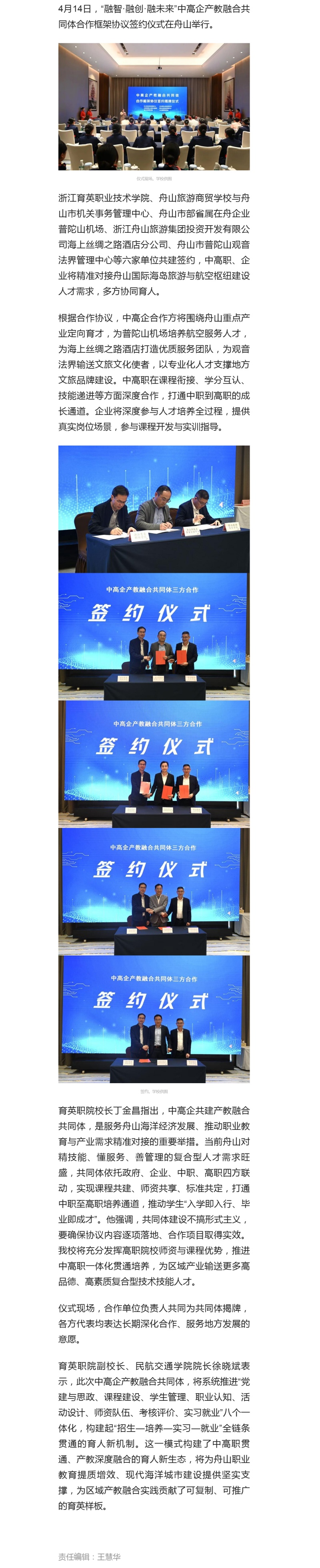 4月14日,“融智·融创·融未来”中高企产教融合共同体合作框架协议签约仪式在舟山举行。