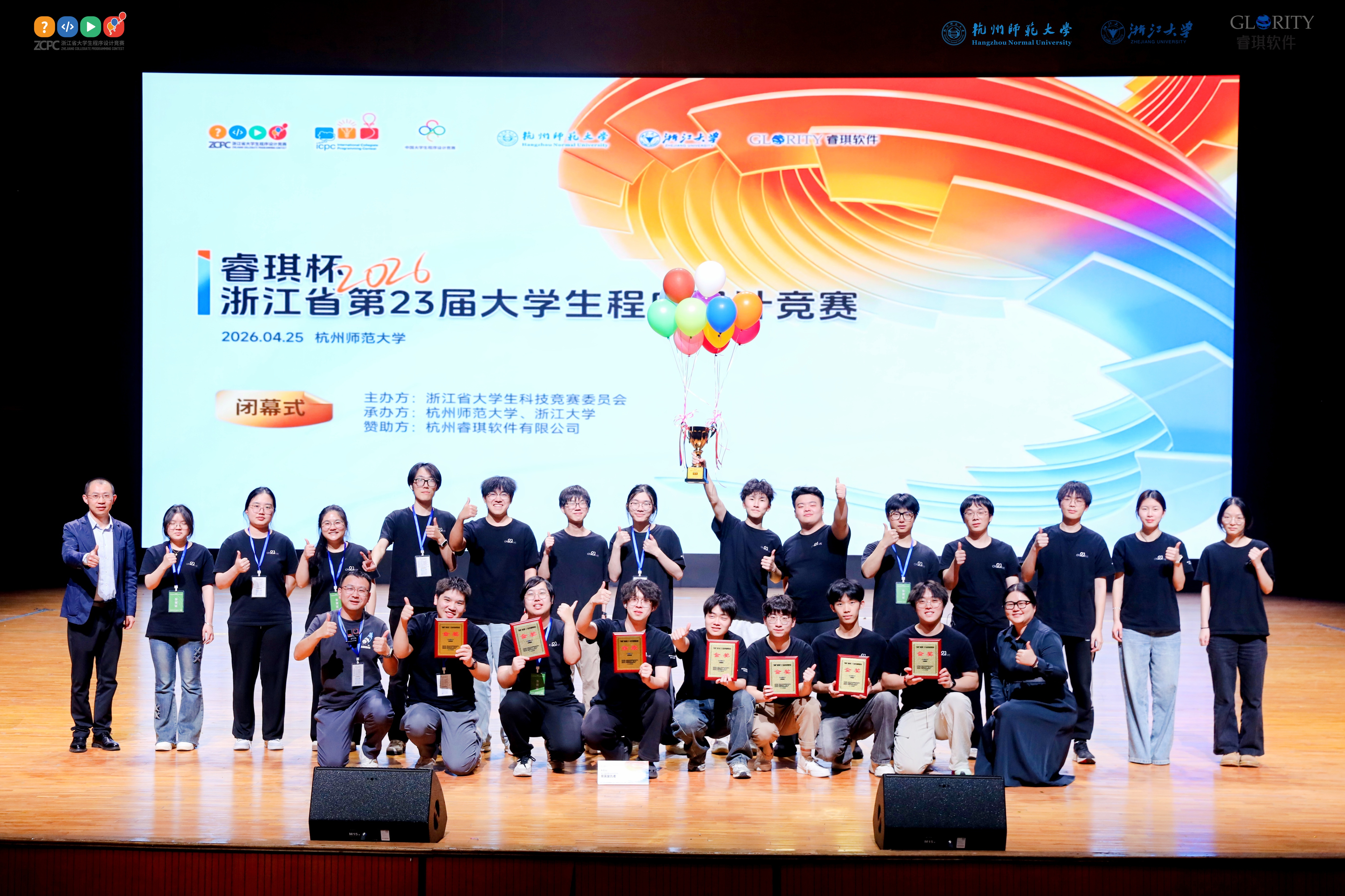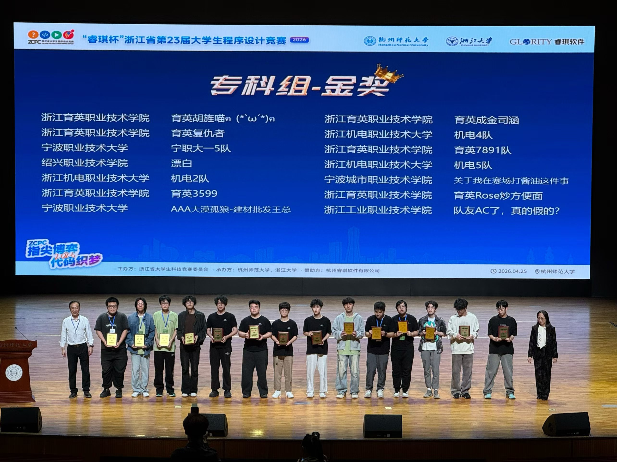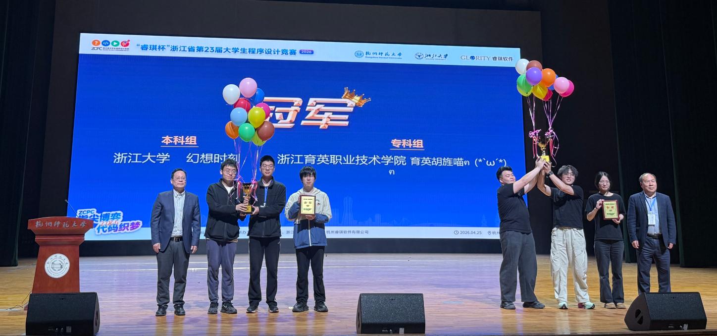2026年4月25日,第二十三届“睿琪杯”浙江省大学生程序设计竞赛在杭州师范大学仓前校区燃情开战。历经五小时巅峰鏖战,浙江育英职业技术学院八支战队强势出击,全部杀入获奖名单,一举豪夺6金1银1铜,以无可匹敌的统治力闪耀全场!其中,由25创意班吴玥葳、胡壹楠、陈旌组成的“育英胡旌喵ฅ(`ω´)ฅ”队,作为专科组中唯一破局5题的王者之师,以断崖式领先碾压全场,霸气问鼎专科组冠军!与此同时,我校更以6枚金牌的绝对优势登顶专科组金牌榜第一,刷新了赛事创立以来高职院校的单届夺金最高纪录!