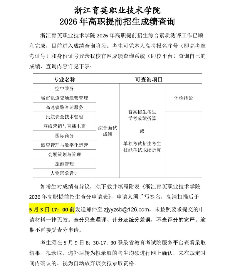 招生咨询 招生公告 报考指南 提前招生 历年分数 2025年招生专栏 录取查询 在线咨询 联系我们 地址:杭州市钱塘区4号大街16号 邮编:310018 电话:0571-86911032、86877189 招生公告 当前位置:首页 >> 招生咨询 >> 招生公告 浙江育英职业技术学院2026年高职提前招生成绩查询 时间:2026-04-30 附件: 浙江育英职业技术学院2026年高职提前招生查分申请表.pdf 点击进入:校平台(5月1日10:00开放成绩查询)