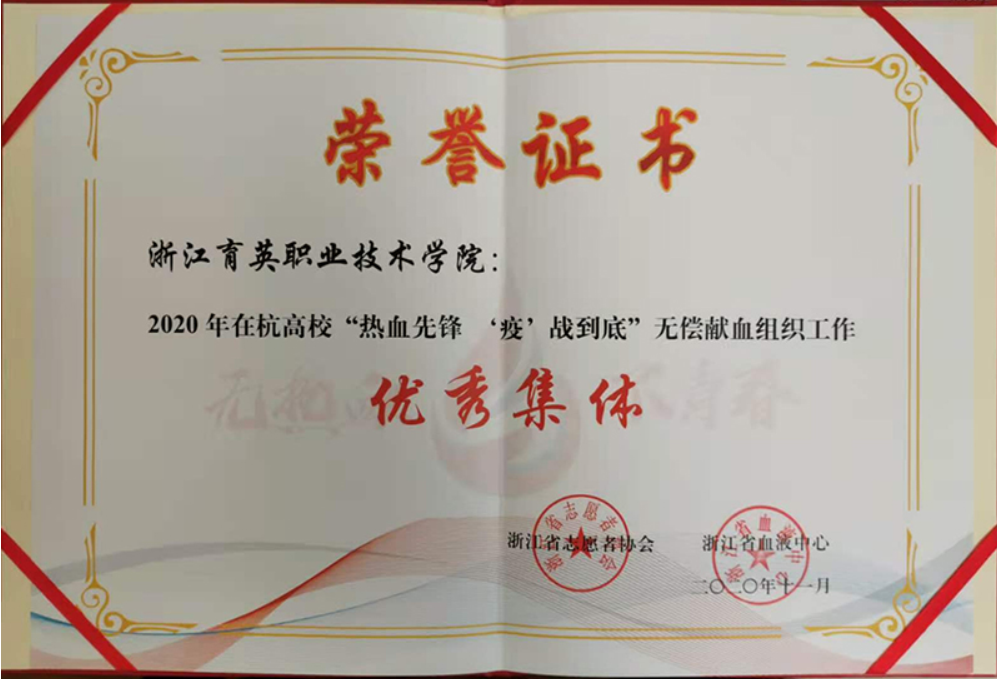 2020年11月学院获得在杭高校“热血先锋‘疫’战到底”无偿献血优秀集体称号
